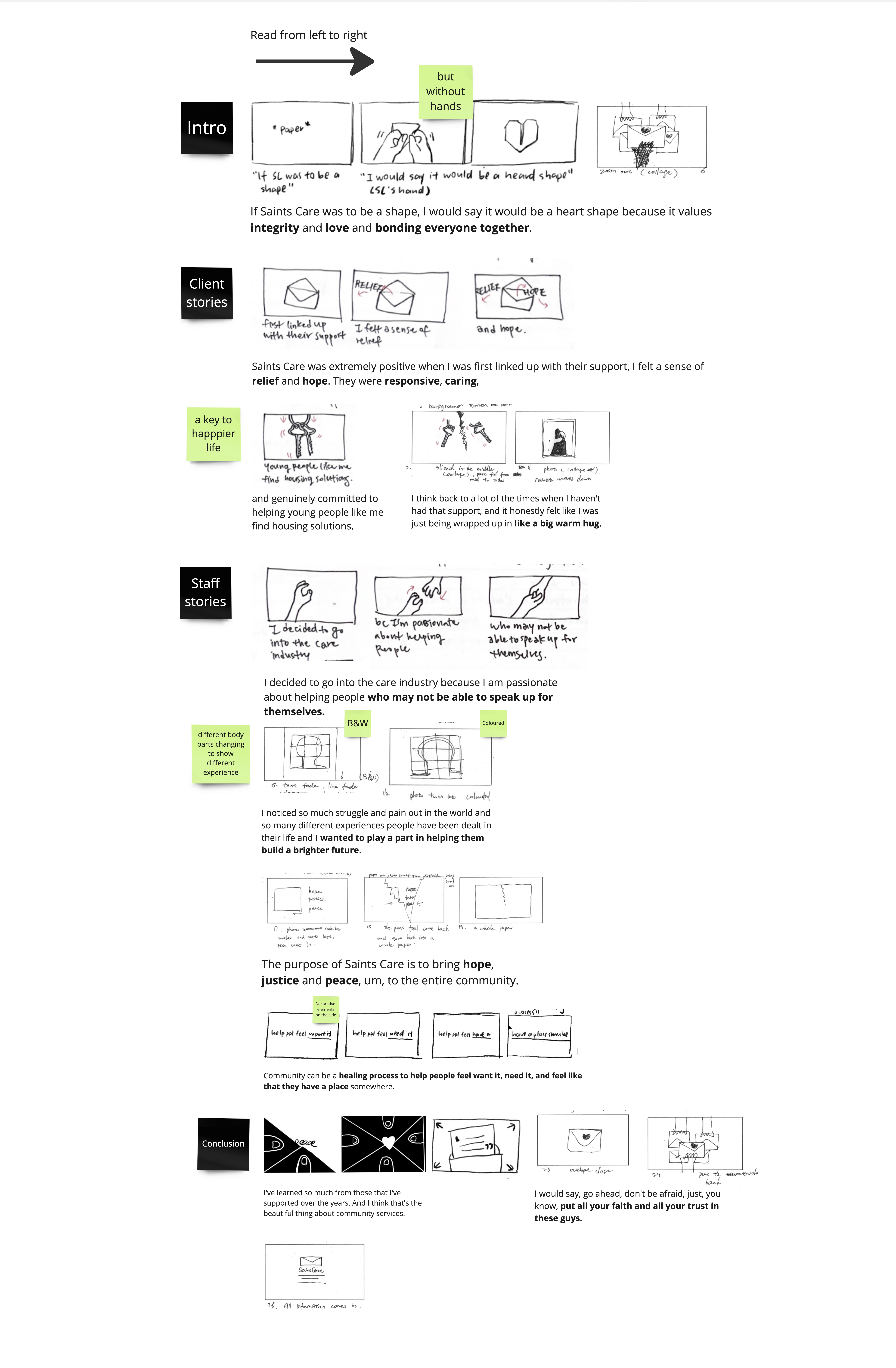 Focusing on SaintsCare’s three core values—community, safe space, and hope—we developed the “missing piece” concept to symbolize the invitation for the audience, clients, and donors to join the community, like completing a puzzle. We used the metaphor of envelopes to tell the story, encouraging the audience to become part of SaintsCare. The narrative begins with a SaintsCare envelope, which reveals the stories of staff and clients, and ultimately returns to the same envelope. Through these stories and voices, the video gradually conveys SaintsCare’s key values to the audience.