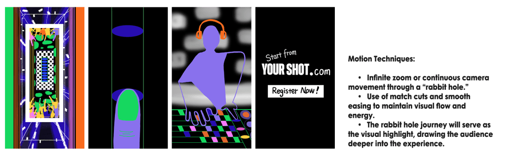 Create a dynamic animation that invites the audience to embark on a DJ producing journey, guiding them from the dream of becoming a DJ to making it a reality. The animation will serve as a call for registration, visually representing the transformative journey through YourShot’s program.